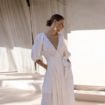 فستان متوسط الطول نسائي أنيق بأكمام منفوخة فتحة رقبة حرف v عميقة مقاس كبير من القطن الكريب غير محدد
